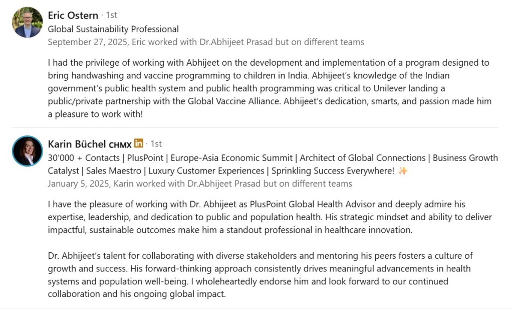 - Former Senior Roles: Spearheaded multi-initiatives at PATH, KPMG, and Hindustan Unilever Limited (HUL), NHS Uk, HIV South Africa and CARE.