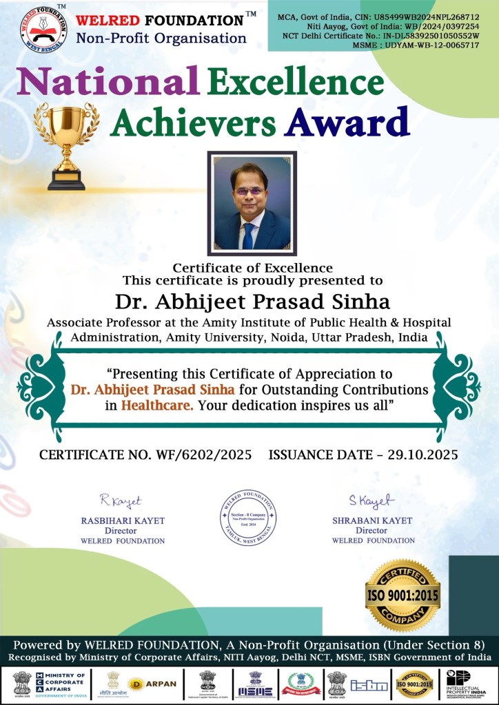 Dr. Abhijeet P. Sinha is a Associate Professor at Amity University of Public Health and Hospital administration at Amity University main campus Noida. Dr Sinha is distinguished professional with decades of experience leading large-scale projects and program portfolios across healthcare, CSR, and ESG consultancy in India, South Africa, and the UK. His expertise spans three continents (Asia, Africa, and Europe), making him a seasoned public health practitioner and an advocate for impactful partnerships.