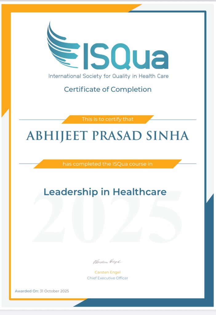 Dr. Sinha’s academic journey includes a PGDM-RM (MBA) from XISS. He also has a Master in Public Health and Management (PGDPHM) from the University of Brighton, UK. He has management training from prestigious institutions. These include the University of Oxford, Cambridge University UK, IIM Ahmedabad, and IIM Bangalore. He has Six Sigma Green, Yellow, Lean Leadership, and Black Belt certifications.
