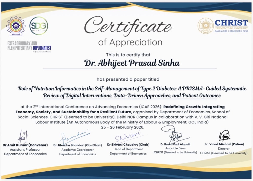 Dr. Abhijeet Prasad Sinha, a noted public health expert and digital health innovator, has received international recognition for his 2023 PhD research titled “Assessing the Utility of Swayam Diabetes Mobile Health Application for Self-Care Management of Type 2 Diabetes in Home Settings.”
