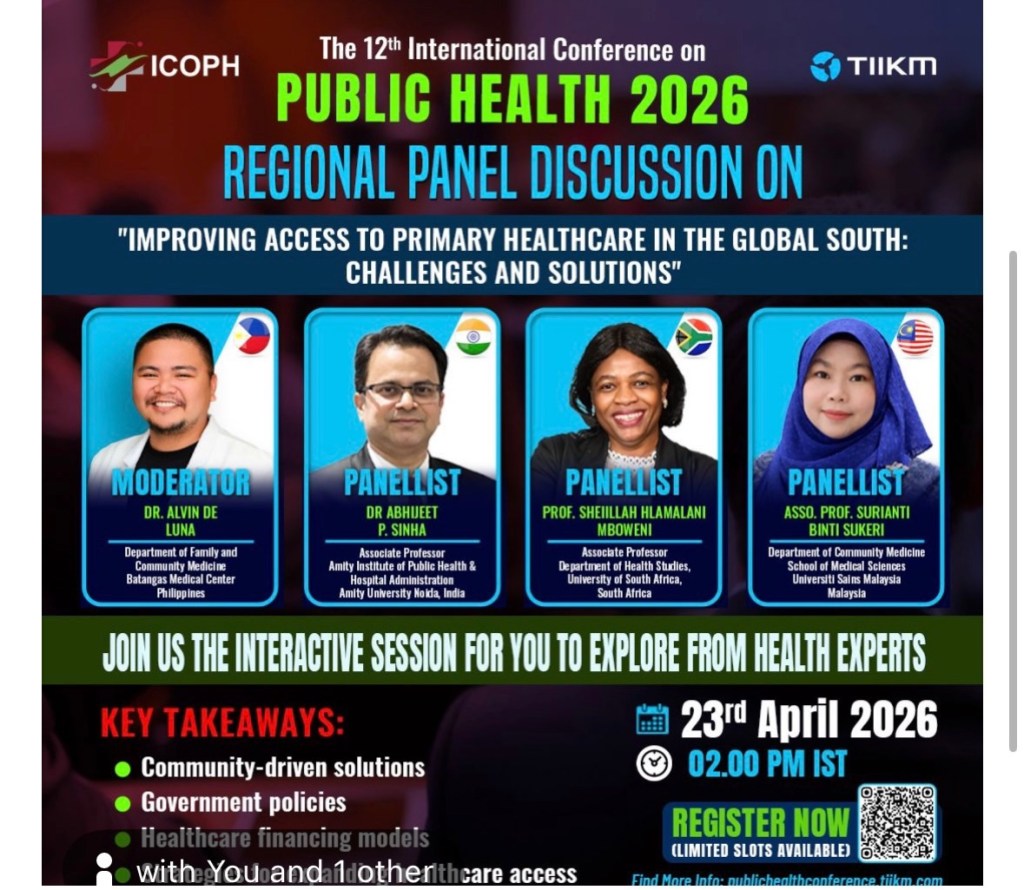 The panel brings together global public health experts from different regions to discuss community-driven solutions, government policies, healthcare financing models, and innovative strategies to improve healthcare access in the Global South.